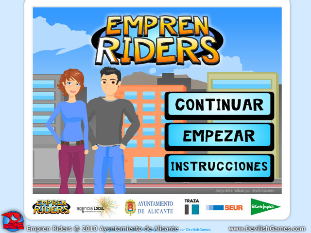 Empren Riders es un videojuego educativo desarrollado por DevilishGames para La Agencia Local del Ayuntamiento de Alicante. Durante el juego los usuarios deberán recorrer todo el camino que sigue un emprendedor para crear su empresa.